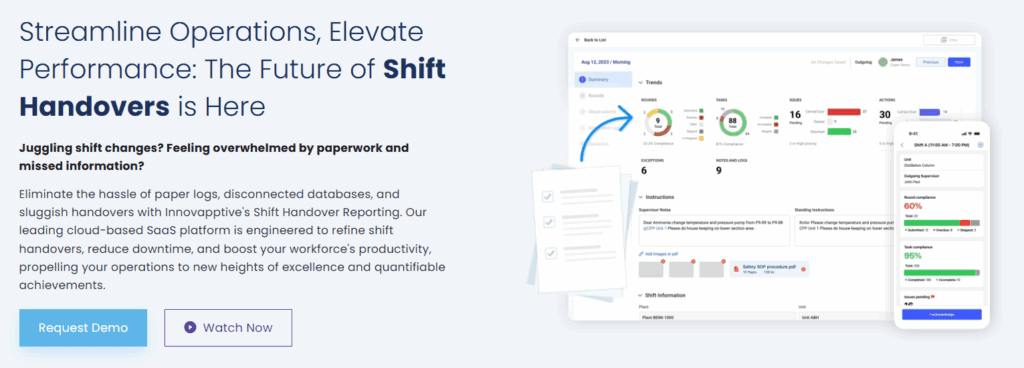 Innovapptive offers a shift handover solution within its connected worker platform. It is designed for asset-intensive operations and integrates with SAP, allowing field teams to document shift activity using mobile devices. The platform supports visibility into open tasks and ongoing work. It is best suited for organizations already invested in SAP workflows, rather than regulated manufacturing environments.